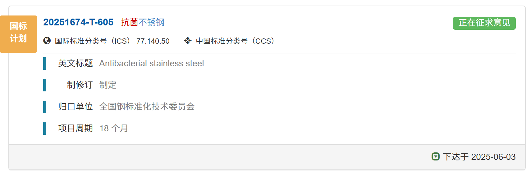 國家標準《抗菌不銹鋼》正在征求意見中,歡迎報名成為參編單位并提出修改意見和建議。01 國家標準計劃《抗菌不銹鋼》已下達國家標準計劃《